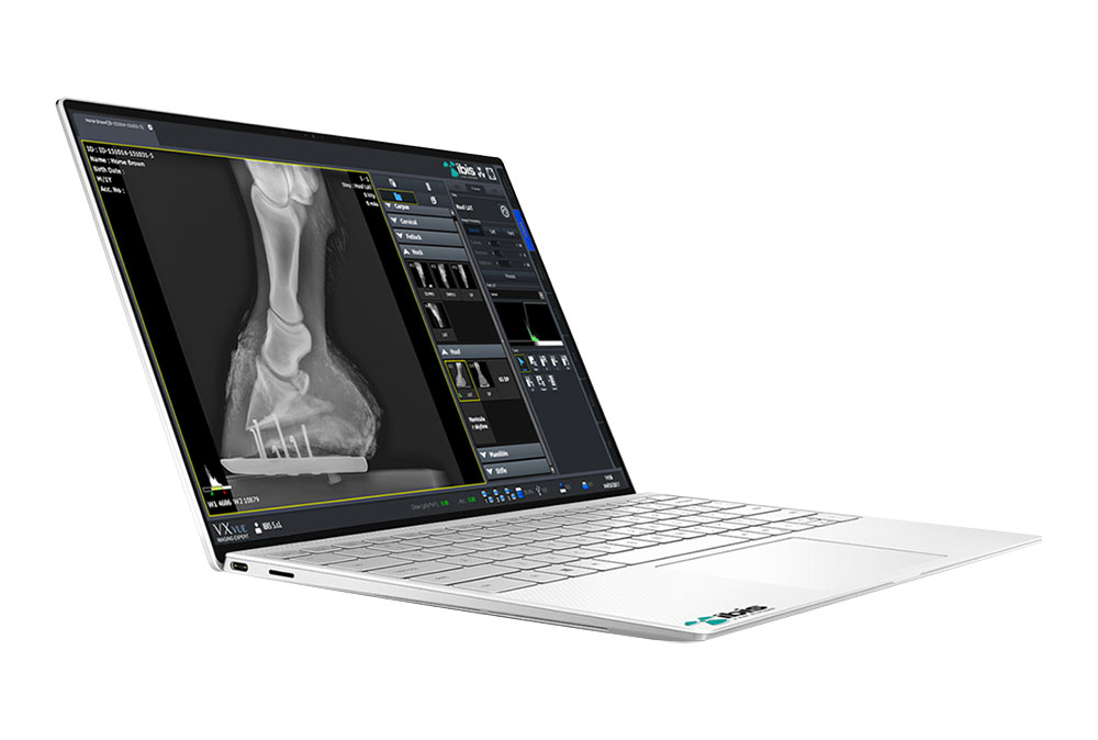 Pannello radiologico digitale EquiRay con computer che mostra una radiografia eseguita sulla zampa di un cavallo